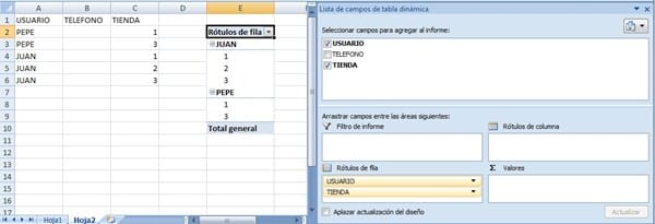 Un usuario puede visitar muchas tiendas, por lo que puede aparecer duplicado. He marcado los duplicados con formato condicional en teléfono, ya que es único para cada usuario.