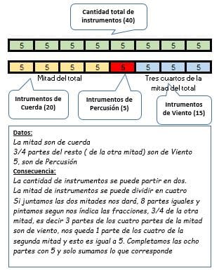 En una orquesta escolar la mitad de los instrumentos son de cuerda, las tres cuartas partes del resto son de viento y hay 5 instrumentos de percusión
