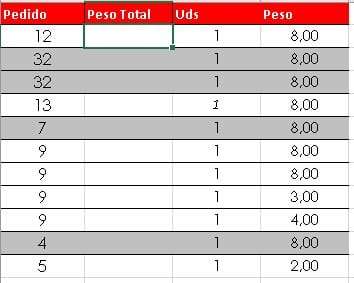 Necesito en la columna Peso Total sumar el total de peso de cada línea tomando como condición el número de Pedido, así en la primera fila el valor de la celda en la columna peso total tiene que ser ocho, en las dos siguientes el valor de la celda en la columna Peso Total 16 (ya que el valor en la fila Pedido es 32), y así en el resto de filas.