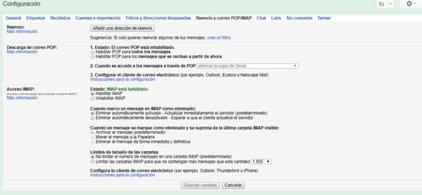 Acabo de configurar el Outlook con la opción IMAP y en la imagen adjunta se ve como lo tengo configurado en gmail. Tengo que organizar mi bandeja de correo y borrar unos cuantos e mails. ¿Cuándo se borra en gmail un correo se borra automáticamente en Outlook, o es a la inversa que al borrar en Outlook se borra en gmail? Creo que hay algo que no tengo bien configurado pq cuando borro en Outlook me siguen apareciendo en gmail. ¿Cuál es el fallo? Gracias