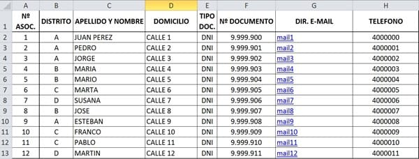Y en otras hojas tengo el mismo cuadro, pero vacío y me gustaría poder escribir el numero de asociado en la columna A y me extraiga los datos de la hoja con el listado general. Por ejemplo escribir 7 y me copie en las columnas de al lado: D - Susana - Calle 7 - DNI - 9.999.996 - Mail7 - 4000006