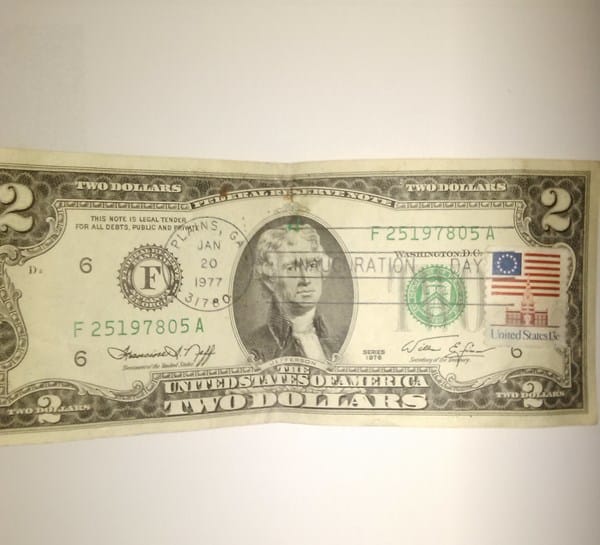 Es un billete que tiene impreso INauguration Day, la bandera de Estados Unidos como si fuera un timbre, un edificio, debajo del el Unite States 13C, un circulo al redeor con las letras siguientes Plains, Ga Jan 20, 1977, 31780