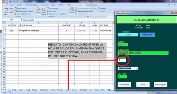 Tengo una planilla en la cual llevo registro de Stock, tiene varias hojas, entrada, salida, precios, etc... En las hojas de entrada y salida voy registrando los materiales por mes, tienen en siguiente orden columna A/codigo - B/descripcion - C/Junio - D/julio E/Agosto y así con los meses, tengo un Userform que al ponerle el código me llena los textbox y registro la cantidad de salida y los pega en una hoja determinada, lo que quisiera es que esa cantidad de salida me los pegue en el articulo que selecciono directamente en la hoja de salida y en el mes que elija. Adjunto foto del userform para dar más idea de lo que necesitaría. Agregaría un combobox con los meses contando a partir de la columna C en adelante.