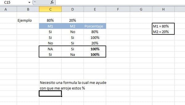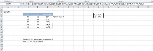 C1 = Si y D1 = No , esto tiene como resultado en E1 = 80%