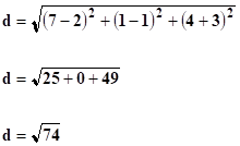 Encuentra la distancia entre los puntos (2,1,-3) y (7,1,4)