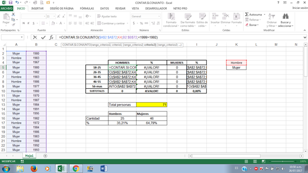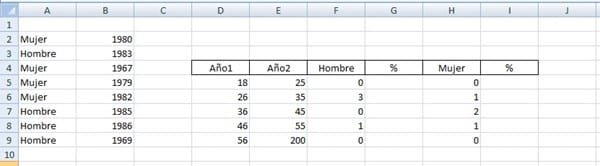 Como pueden ver en la imagen necesito que me funcione la fórmula pero no se como hacer para que me cuente entre rangos para sacar las edades por ejemplo entre 18-25 que en años seria 1999 y 1982 par el rango de edad no se como hacer para que funciones.
