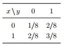 Sean X y Y dos variables aleatorias discretas con función de probabilidad conjunta dada por la tabla que aparece abajo. Encuentre la función de distribución conjunta F_(X, Y) (x, y) y a partir de ella encuentre las funciones de distribución marginales F_X (x) y F_Y (y)