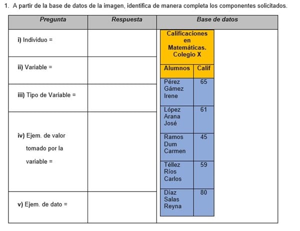 A partir de la base de datos de la imagen, identifica de manera completa los componentes solicitados.