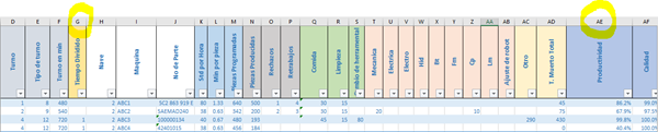 En la imagen se muestra un archivo que mide OEE en una empresa, el detalle es que en la columna G he agregado el tiempo dividido, aquí quisiera que si el valor es 1 en dos o diez o más filas entonces sume los valores de la columna AE, pero solo de las filas que tienen el 1 en la columna G.