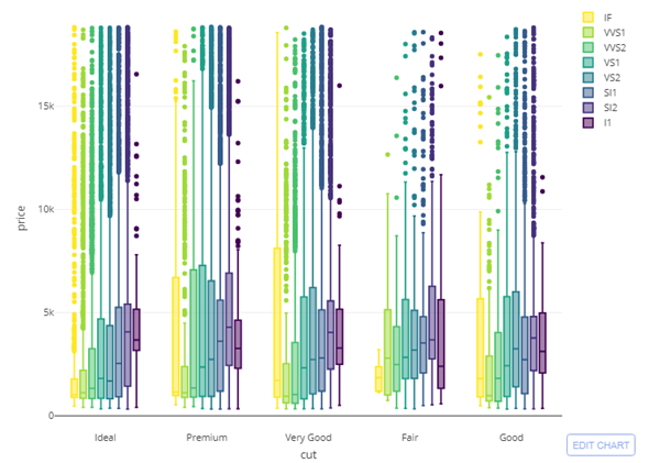 p <- plot_ly(ggplot2::diamonds, x = ~cut, y = ~price, color = ~clarity, type = "box") %>% layout(boxmode = "group") # Create a shareable link to your chart # Set up API credentials: https://plot.ly/r/getting-started chart_link = api_create(p, filename="box/group") chart_link