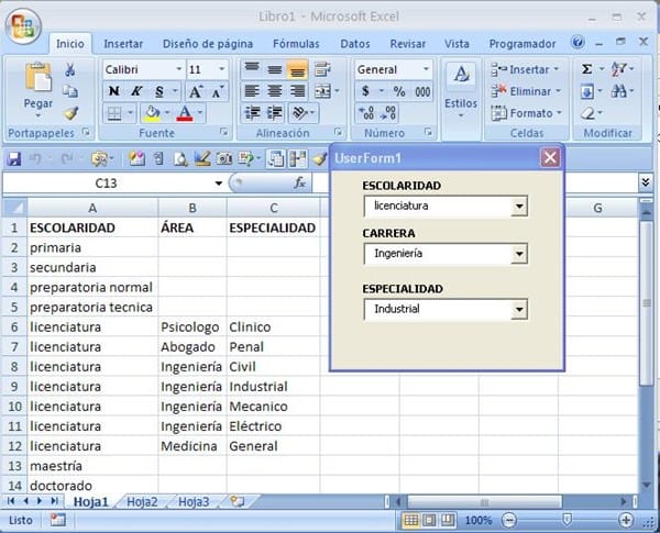 Por ejemplo si yo selecciono grado de estudios las opciones serian primaria, secundaria, preparatoria, licenciatura y si selecciono la opción de licenciatura me de una lista con carreras en otro combobox. Así mismo que esta información me la guarde en una hoja de excel.