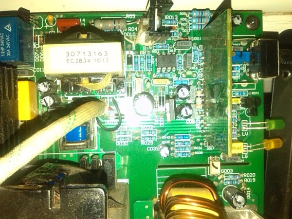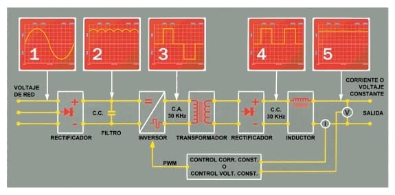 Digo lo de la muestra porque si la fuente auxiliar está funcionando ese trafo pequeño no forma parte de ésta y al estar cerca del trafo de potencia y ver que sus pistas van a la tarjeta de control no le doy encontrado otra explicación. No sé si en esta máquina el led amarillo significará lo mismo porque me descargué el manual de otra inverter una Telwin Tecnica 164 y en esa el led amarillo significa que la máquina está en protección o bien por temperatura o por sobre voltaje o bajo voltaje, casi me imaginaría que puede que sea igual porque al lado del led amarillo en la mía hay un símbolo similar a un rayo y a su lado otro símbolo con un termómetro.