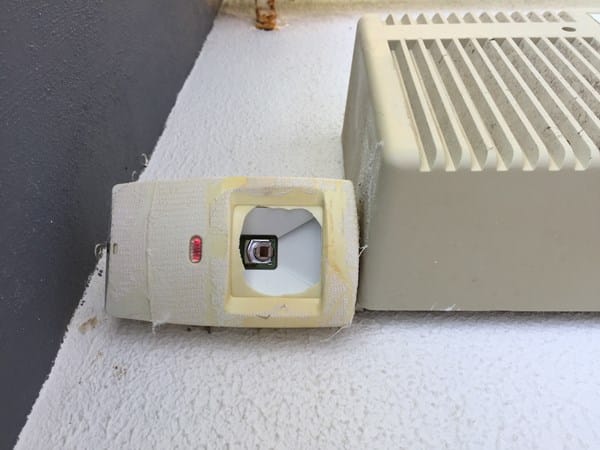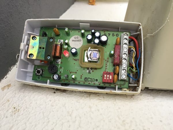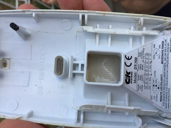 El problema es que éste es un sensor interior y está instalado en el exterior. Cuando se instaló fue un error y ahora tiene que ser anulado siempre cuando tiene que armar el sistema. Por lo tanto, es un problema porque no se pasa por alto las alarmas cuando por ejemplo un pájaro está volando casi.