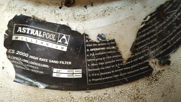 Tengo un filtro de arena de sílice Astralpool Millenium series 2000 High Rate Sand Filter. No dispongo de muchos datos ya que la pegatina con los mismos esta muy deteriorada.