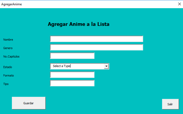 Ahora me gustaría saber si hay una forma, y como se hace o como lo puedo buscar en internet, para que en el campo "Estado", cuando agregue un nuevo registro a la hoja de excel, me salga una lista desplegable con opciones... Y yo pueda seleccionar una, algo como lo que muchos formularios tienen con sexo (masculino, femenino) o País(donde se despliega una lista de países)