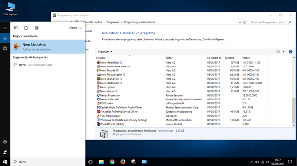Como veis pongo "nero" y sale en cortana NERO MEDIA HUB, y "ver resultados web" pero tooodo el listado de miniaplicaciones nero (o maxi, que en realidad quiero desinstalar) no aparecen. Sin embargo si pongo "disc" sí sale "nero disc speed". Esto me pasa con muchas búsquedas que realizo, no entiendo la lógica que usa para mostrarte unos resultados y otros no.