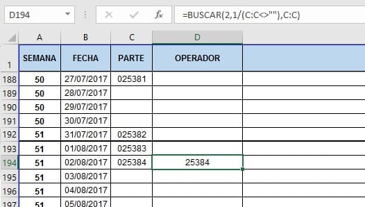 El ultimo parte fue 007213 y tenia fecha del 31/07/2017, esa fecha como la puedo ubicar por medio de fórmula es decir si ingreso el parte 007214 en el día 01/08/17 me de esa fecha y a si sucesivamente.