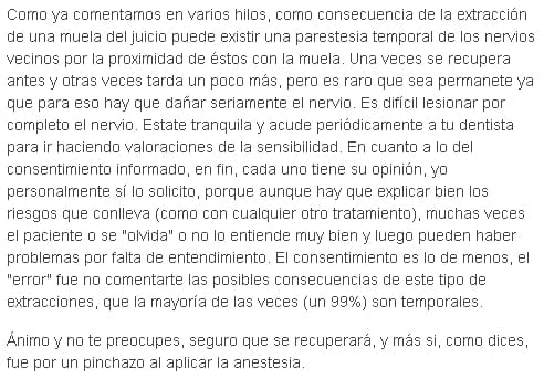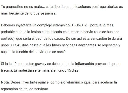 Hace 12 días me extrajeron las muelas del juicio y (como a muchos en este sitio) me quedó la mitad de la lengua dormida. Ante mi preocupación, y con la indicación de mi dentista, comencé a tomar complejo vitamínico B. ¿Qué siento?: