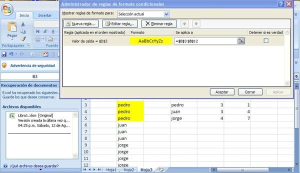Necesito saber si hay una formula con la que pueda "encontrar"y tomar todos los datos repetidos; solo veo ejemplos con esta funcion contar. Si donde con una lista desplegable va eligiendo "buscar" el nombre repetido;lo que yo preciso y no le encuentro aun la vuelta es que si el nombre pedro se repite 5 veces y el de juan y jose tambien, que me "tome" todas las veces q se repiten "todos" los nombres y no solo de a uno por vez;gracias al que me pueda ayudar o al menos lo intente