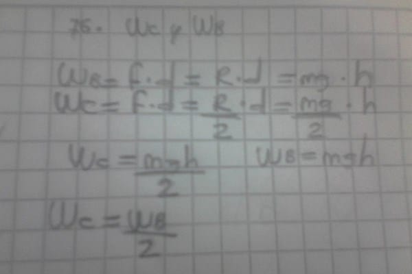 Hola, necesito saber porque la respuesta correcta es la A, yo pensaba que era la B, porque si el trabajo es =fuerza* desplazamiento y la fuerza del obrero B es igual a la resistència y la resistència es = al peso, entonces el trabajo de B es mgh y si la fuerza del obrero C es igual a la mitad de la resistència y la resistència es igual al peso, entonces el trabajo de C es mg/2 * h, entonces el trabajo de
