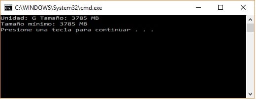 Luego ejecuto el amra.bat sin más que escribir su nombre "amra" y ahí sale la unidad G con su tamaño (esta SD es de 4 GB). Como solo hay una el mínimo es el mismo, claro, pero puedes ver que hasta que no cierres la ventana CMD lo tienes ahí. Si quieres poner un PAUSE lo pones como última instrucción del bat. Quedaría así: