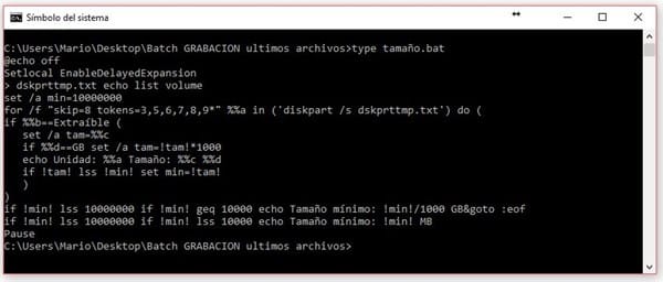 3-Mi archivo se llama tamaño.bat, le hago primero un "type tamaño.bat" y me aparece lo de la imagen: