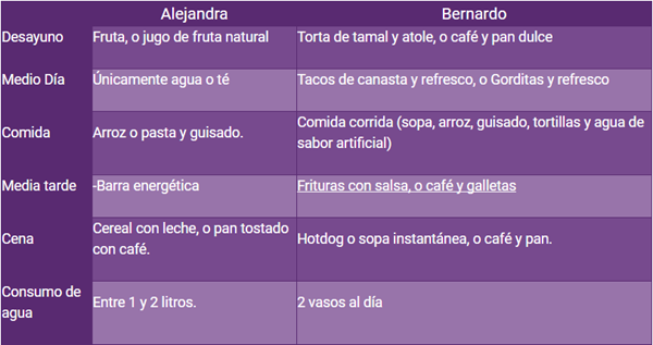 Tanto Bernardo como Alejandra han seguido una dieta muy poco variada durante los últimos 5 años, generalmente en un día común sus alimentos son: