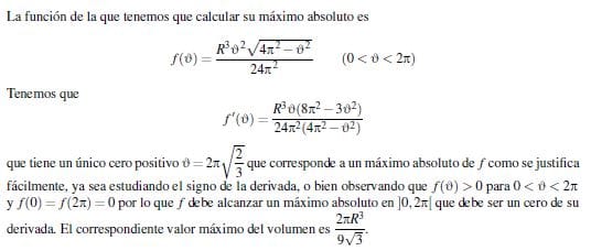 Obtengo la función de el volumen del cono respecto del ángulo, hasta allí todo me sale igual pero luego cuando derivo, ya mi resultado difiere del que han dado en la respuesta. A mí me sale el ángulo igual a