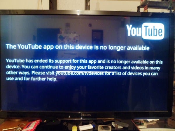Sobre el App, dice el mensaje que youtube ya no apoya ni le da soporte a esa aplicación y por lo tanto la plataforma YouTube no está disponible en ese aparato ni formato. En definitiva, que te han jodido y te han quitado uno de los pocos placeres de tener una tele asi en casa.(Yo que tu la vendía, jejejej).