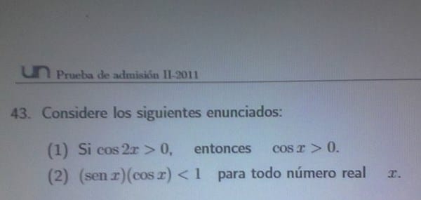 Entonces quedarìa: cos 2x = cos^2 x - sen^2 x > 0, y ahora que sigue, como resuelvo la inecuaciòn, debe ser fàcil pero no lo se.
