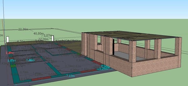 - Quisiera cerrar perimetralmente el espacio con muro de exterior de 1 metro de altura. Los pilares verticales irían embutidos en este muro hasta el metro de altura y de ahí hasta su nivel superior en ladrillo a modo de columnas de base cuadrada.