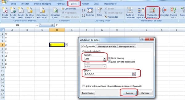 Necesito ingresar en un campo de Excel solo: A, B, C, D, E (solo una de ellas y mayuscula)