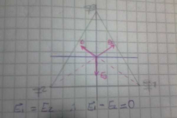 Fìsica: Para que el campo elèctrico resultante en el centro del triangulo equilàtero sea 0, se debe colocar en el otro vèrtice.