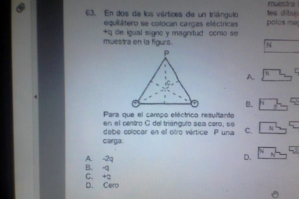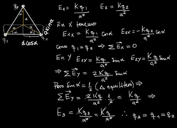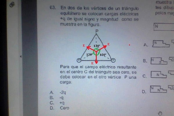 Tengo este ejercicio: Si en un triangulo equilàtero tengo 2 cargas positivas, ¿qué carga debe ser la tercera para que el campo en el centro del triangulo se anule?