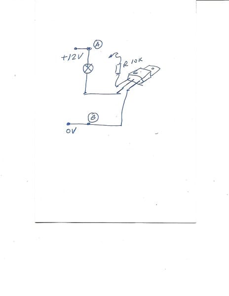 Con el cable soldado a la resistencia, al tocar el punto B (0 voltios), la lampara debe permanecer apagada. Al tocar con ese cable el punto A (+ 12 voltios), la lampara debe encenderse.