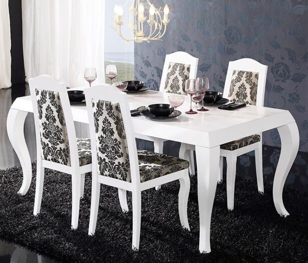 Tengo un salón comedor, y en la parte del salón tengo un mueble de madera blanca con patas isabelinas y frente a él un chaise long de piel negro. Mi pregunta es: en la parte del comedor que quedaría mejor, ¿una mesa y sillas tipo polipiel negras o una mesa y sillas blancas de madera?