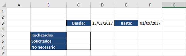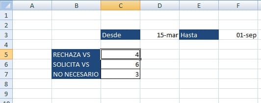 Y en otra hoja llamada Resultados quiero contabilizar los resultados que hay de Solicita Vs; Rechaza Vs y No necesario entre un rango de Fechas y contando las que no tengan fecha baja puesta.