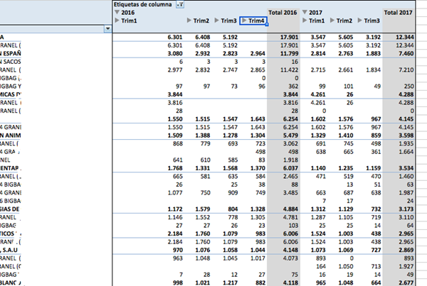 Tengo una tabla dinámica con subtotales por columna y por filas. La tabla contiene datos para todos los meses, en este caso desde 2016 hasta agosto 2017. Tengo agrupaciones por trimestres y por años. Quisiera calcular el porcentaje de variación entre Trimestre 1 de 2017 y Trimestre 1 de 2016, idem para los demás trimestres.