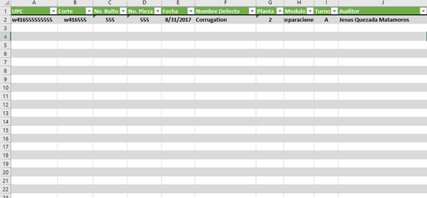 Private Sub btn_guardar_Click() If esc_upc & lista_def = Empty Then MsgBox "VERIFICAR QUE LOS CAMPOS ESTEN LLENOS", vbOKOnly, "CAMPOS VACIOS" esc_upc.SetFocus DEFNOMBRE = Clear Else ActiveSheet.Cells(2, 1).Select Selection.EntireRow.Insert ActiveSheet.Cells(2, 1) = esc_upc ActiveSheet.Cells(2, 2) = esc_corte ActiveSheet.Cells(2, 3) = esc_bulto ActiveSheet.Cells(2, 4) = esc_pieza ActiveSheet.Cells(2, 5) = esc_fecha ActiveSheet.Cells(2, 6) = lista_def ActiveSheet.Cells(2, 7) = txt_planta ActiveSheet.Cells(2, 8) = txt_modulo ActiveSheet.Cells(2, 9) = txt_turno ActiveSheet.Cells(2, 10) = txt_auditor esc_upc = Empty esc_corte = Empty esc_bulto = Empty esc_pieza = Empty DEFNOMBRE = Empty esc_upc.SetFocus lista_def.ListIndex = -1 End If