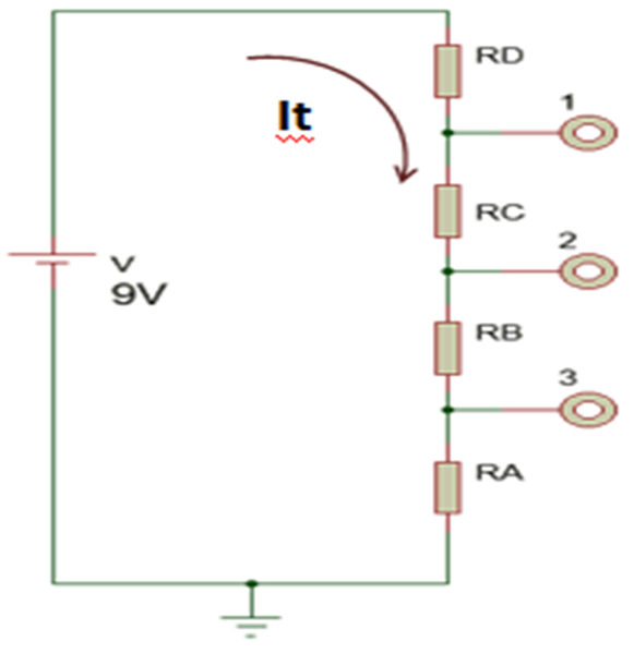 2. Se tienen 5 dispositivos electrónicos que requieren 3 niveles de voltaje diferente entregados mediante un divisor de voltaje como el que se muestra a continuación.