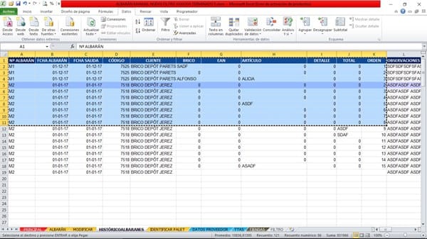 He creado en excel un albarán manual. Como principales pestañas tiene "ALBARÁN" "EDITAR" "MODIFICAR" "HISTÓRICOALBARANES" "FILTRO", además de otras que no son relevantes para el caso.