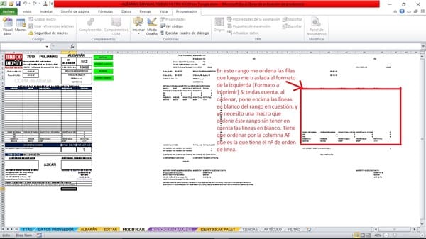 He optado por utilizar la primera opción que me dices y me ha salido genial, salvo por un detalle. Lo que me falta en esta opción, para mostrarme las lineas del albarán en la plantilla tal cual las creé. Necesito una macro que ordene un rango de celdas, (ej que necesito), de la AA13 a la AF36, pero que tenga en cuenta los espacios en blanco, ya que actualmente me muestra las lineas ordenadas pero al final del albarán, es decir, cuando ordena el rango, tiene en cuenta las lineas  en blanco y me baja las líneas con datos al final de la página. Te añado una imagen para que veas el resultado. Por favor, si tienes alguna duda dímelo. Además te copio la macro que creado para ordenar el rango. Si ves algo extraño no te asustes jjjjj, soy neófito en esto del excel, pero me apasiona y lo que hago es copiar macros y adaptarlas a mis necesidades.