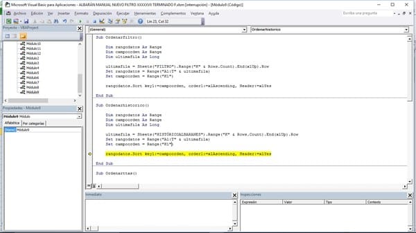 Hola Elsa. Éste problema lo conseguí resolver ordenando automáticamente en la página "FILTRO", justo antes de pasar los datos a la página "MODIFICAR". Ahora me surge otro problema y es que cuando modifico un albarán, en la pestaña "HISTÓRICOALBARANES" me elimina todos los registros del albarán y me crea los nuevos, pero necesito que justos cuando termine de incluir todos los registros nuevos, me ordene la página "HISTÓRICOALBARANES" con una macro que ordene por dos campos distintos, primero por la columna 1 y luego por la columna 11, de tal forma que los registros en "HISTÓRICOALBARANES" queden de la siguiente forma, primero ordenados por la columna albarán y segundo ordenados por la columna orden. No sé crear ésta macro: Adjunto pantalla. Gracias de nuevo por tu tiempo. Eres muy amable