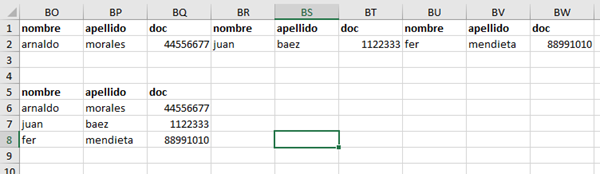 Tengo un archivo de excel que extraigo de una base de datos MongoDB. El mismo agrupa los registros de filas en cada columna. Es decir, en vez de que los registros estén uno debajo de otro, están de lado extiendose por las columnas de excel hacia la derecha. Cada registro ocupa 21 posiciones y se inician en la columna correspondiente a BO que es la numero 67 en excel.