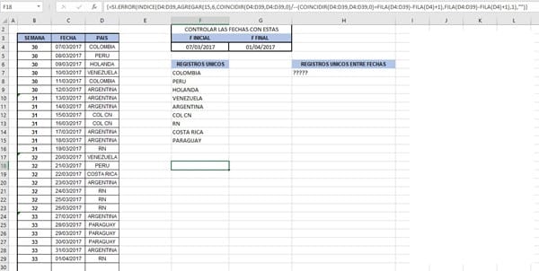 Pero se requiere poder filtrar una lista con registros únicos entre las fechas comprendidas según las celdas F4 y G4 sin tablas dinámicas, sin macros.