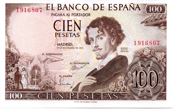 Billete de 100 ptas año 1965 con numero de serie sin letra