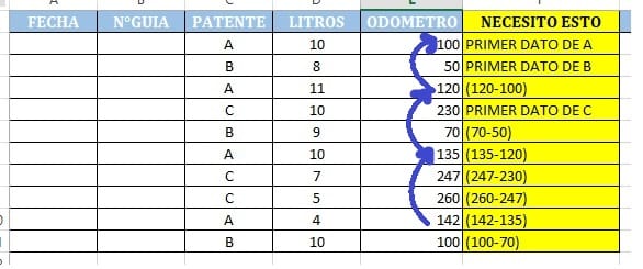 Tengo una base de datos muy extensa, donde registro datos (por ejemplo de 3 patentes )siempre tendré datos nuevos, asociados a las mismas patentes, en diferentes ordenes y con diferentes cifras. Lo que necesito es una fórmula que al agregar un nuevo registro para la patente "A" vaya al registro anterior de "A" y reste ambos odómetros como muestro en la foto, y que cada vez que vuelva a poner un resgistro, repita la misma acción para cada una de las patentes.. Doy el ejemplo para la patente "A", pero necesito que lo haga con todas las patentes, ¿me pueden ayudar?