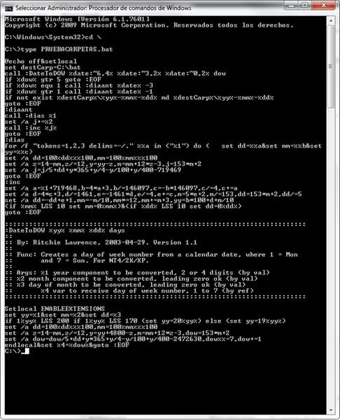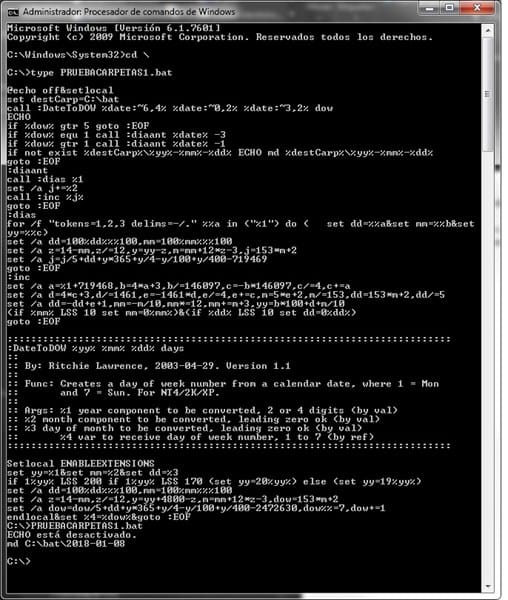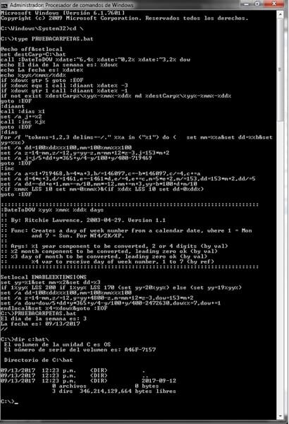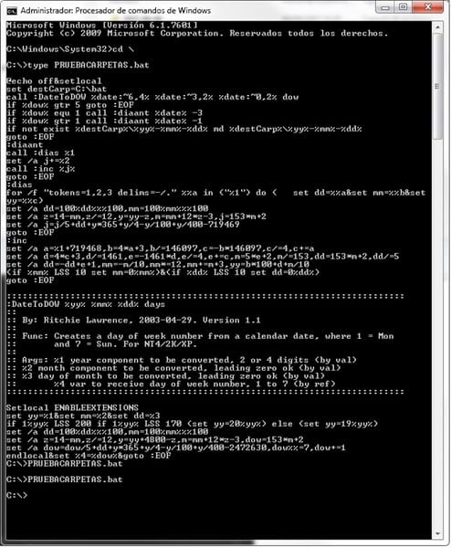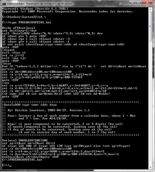 3. Comprobar que el bat está ahí y, de paso, revisar su texto. Si hemos llamado al bat CarpDiaAnt.bat (por ejemplo) tecleamos el comando "type carpdiaant.bat".