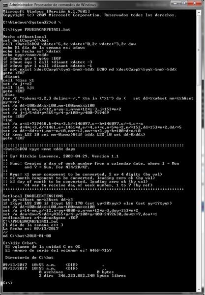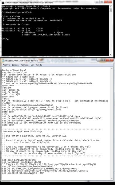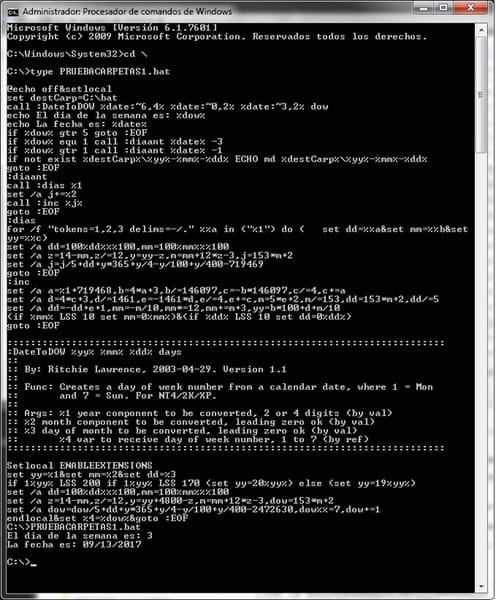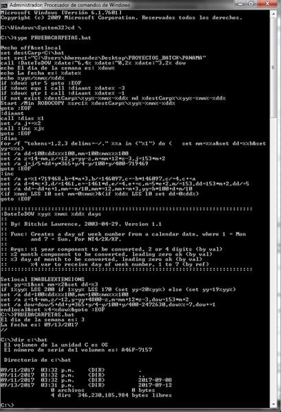 Otra aclaración: acabo de comprobar que si no existe C:\bat el comando MD la crearía y colgaría de ella las carpetas de fechas. Por tanto solo queda pendiente la ejecución del bat: teclear en C:\> el comando PRUEBACARPETAS (puede ser en minúsculas).
