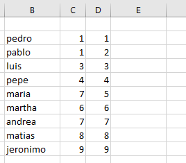 La siguiente información corresponde a tres columnas en excel, necesito que en la cuarta columna aparezca el nombre de la persona con numero repetido